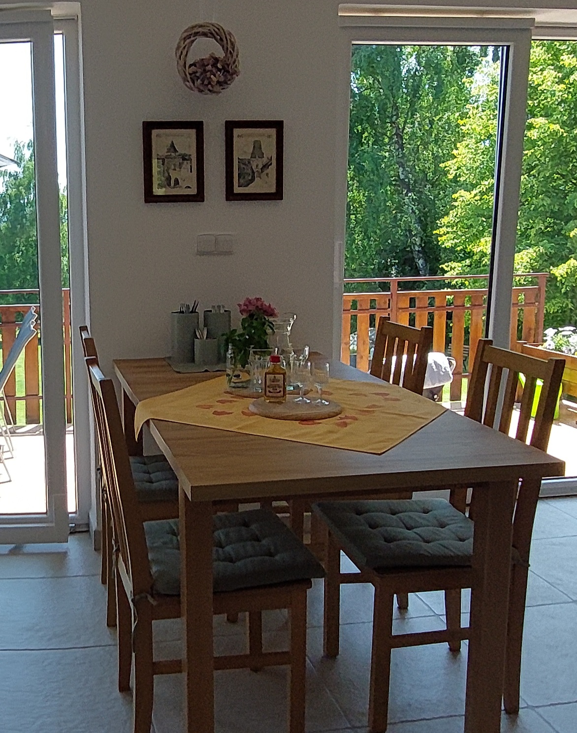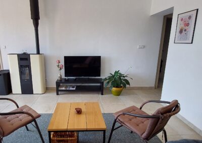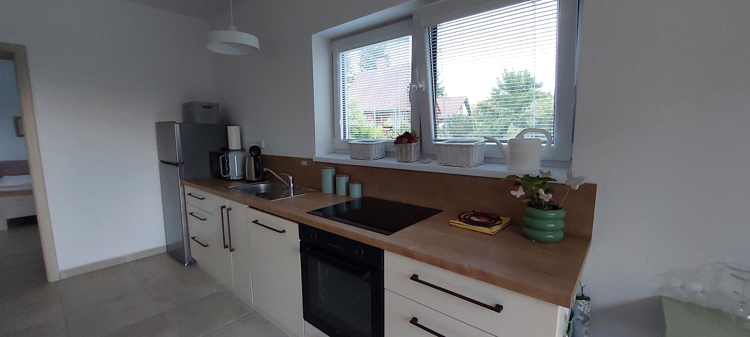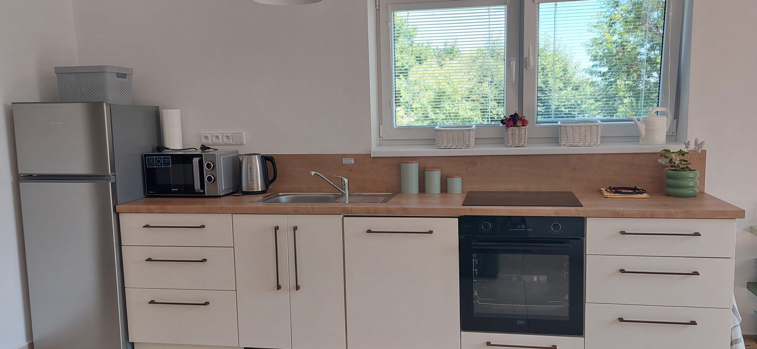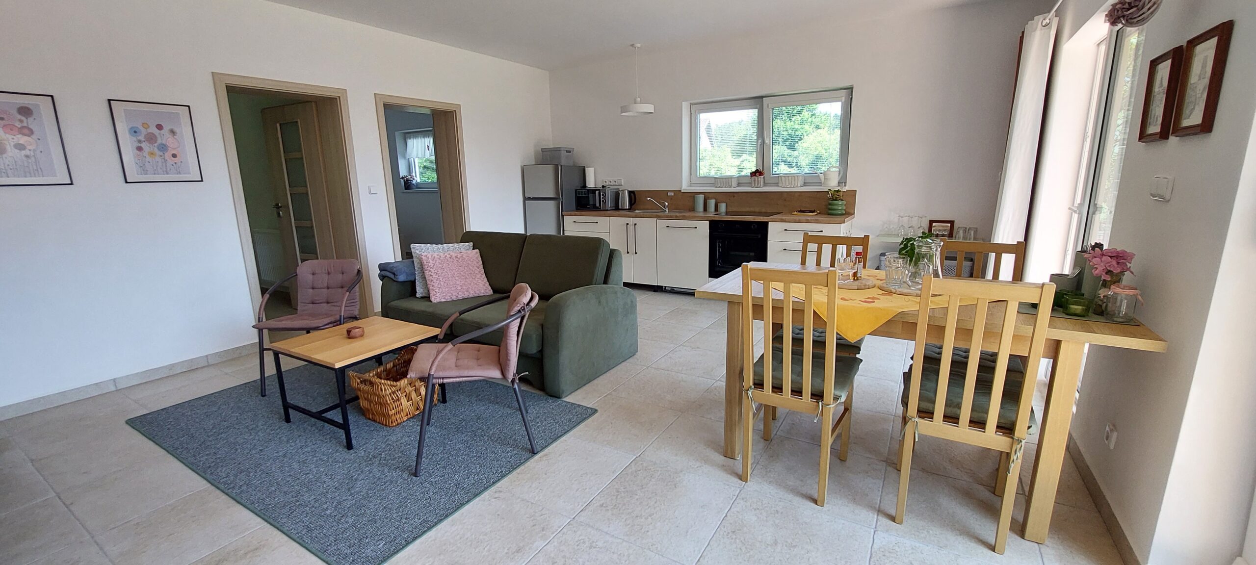Obytná místnost 30m2: kuchyňská linka /sklokeramická, čtyř – plotýnková varná deska, pečící trouba, myčka na nádobí, mikrovlnná trouba, varná konvice, lednice s odděleným mrazícím boxem, nádobí k vaření i stolování, extra nádobí k venkovnímu použití. Pohovka s možností rozložení k přespání (137×198 cm), 2 malá zahradní křesílka, konferenční stolek, TV (anténa ), Wifi /květen-říjen/, jídelní stůl (stolování pro max. 5 osob), kamna na pelety. Z místnosti se vchází do dvou samostatných, malých ložnic, do koupelny a na WC, dále na slunnou terasu se zahradním nábytkem. V objektu je užitková voda/v květnu posíláme vzorky k posouzení, zda je voda pitná-informaci budeme sdílet/. V případě, že voda nesplní status pitné vody, klient obdrží balení pitné vody na pobyt a apartmá.