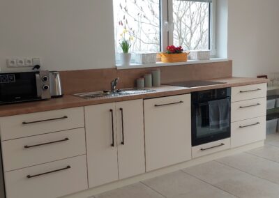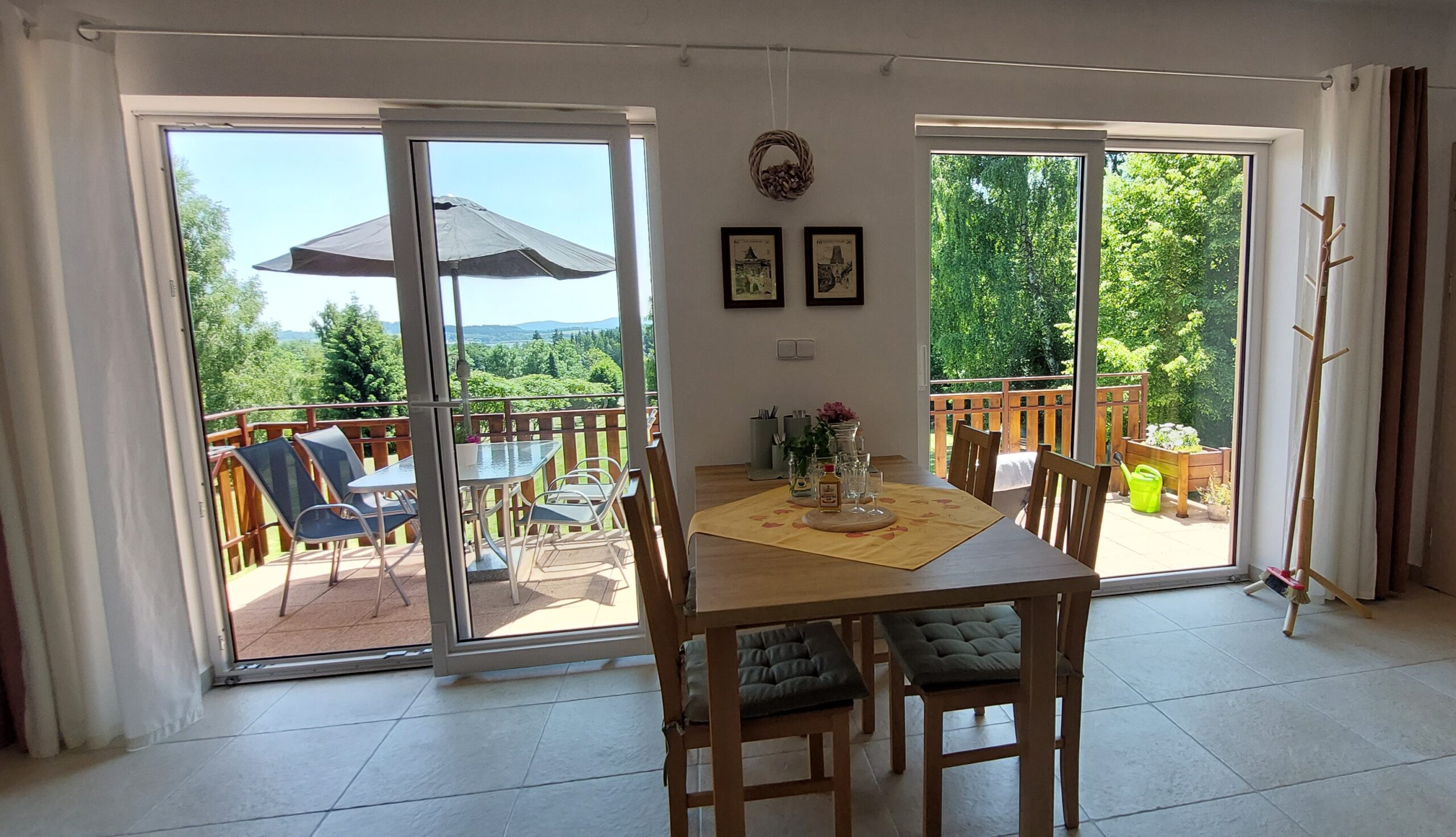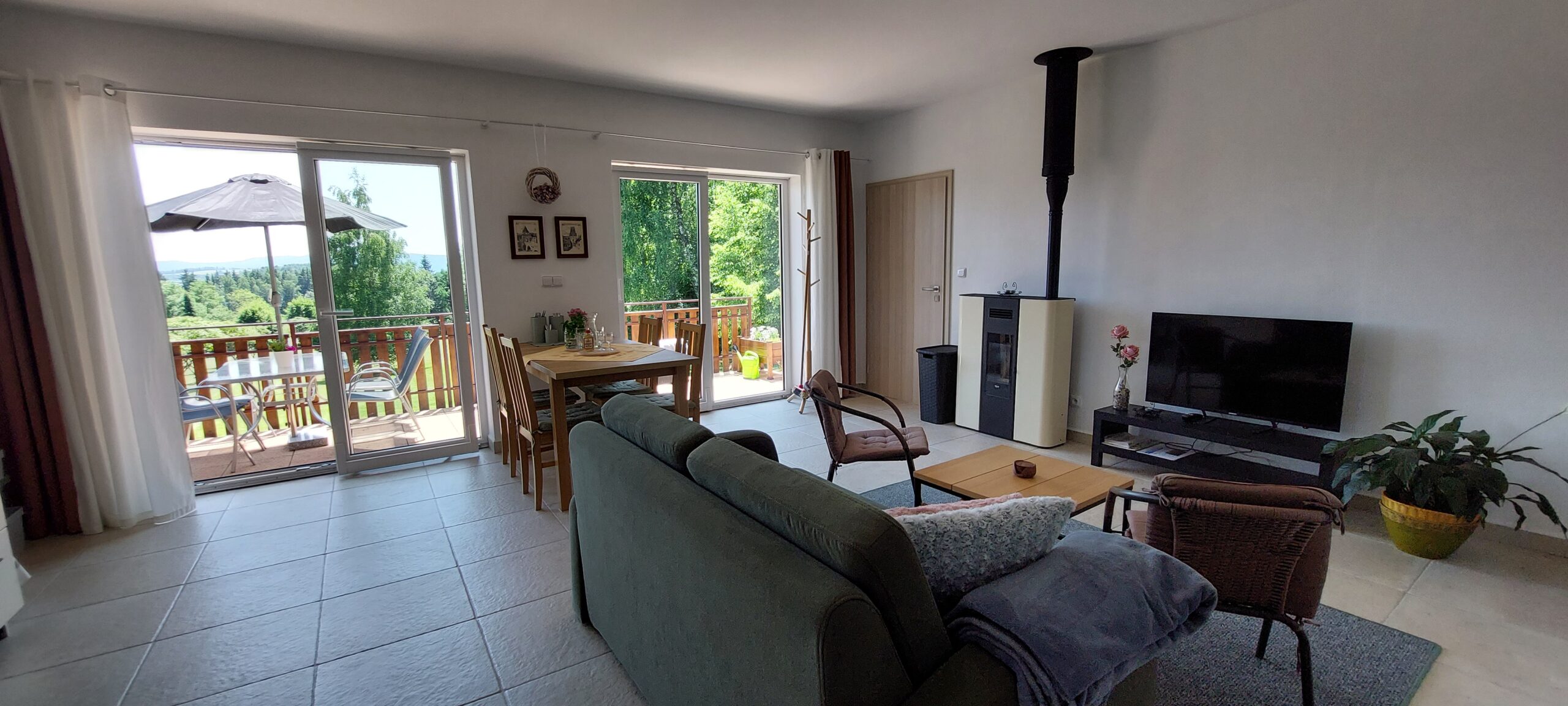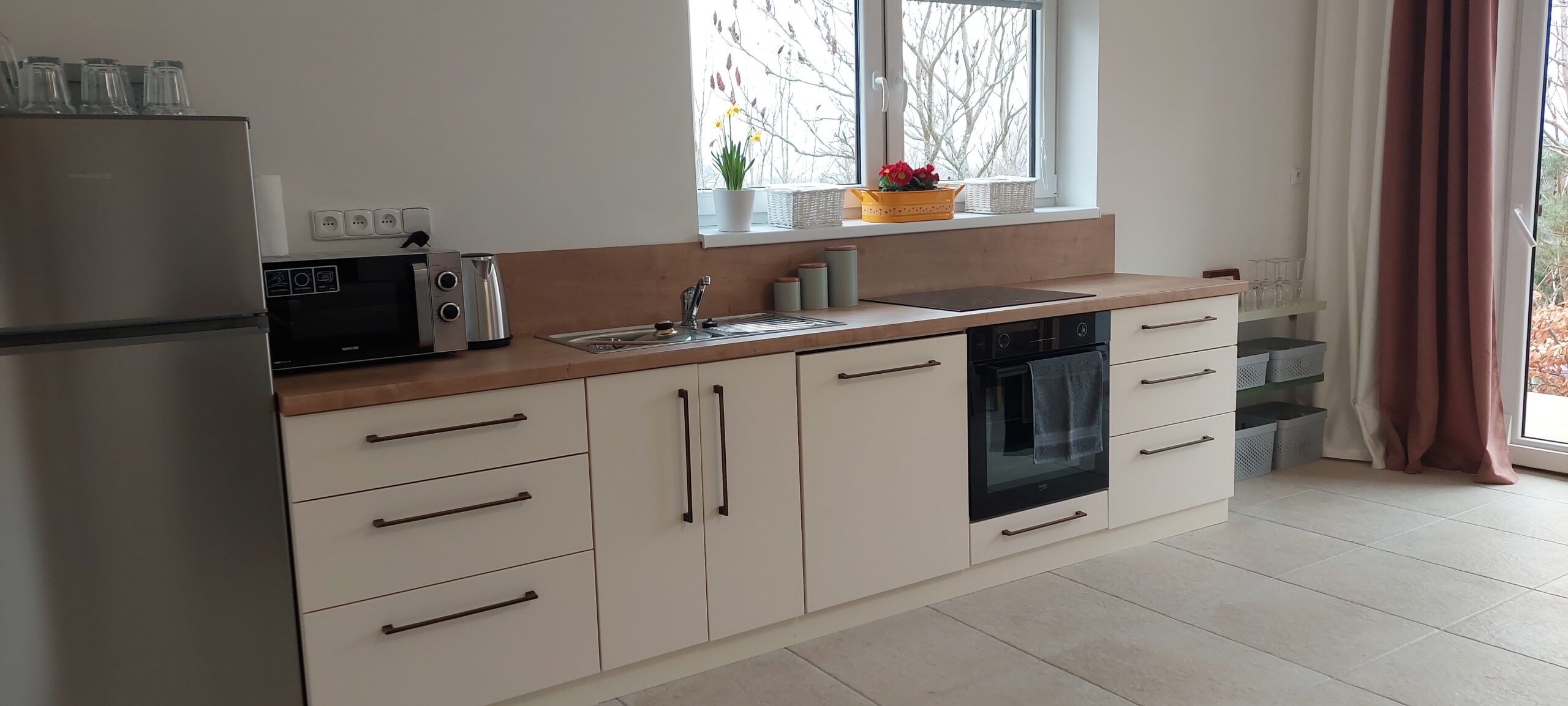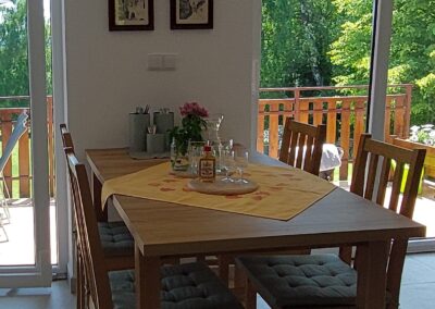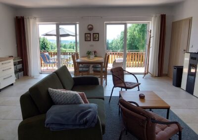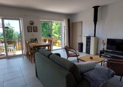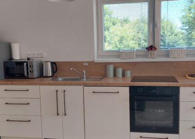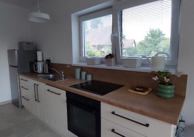 Obytná místnost 30m2: kuchyňská linka /sklokeramická, čtyř – plotýnková varná deska, pečící trouba, myčka na nádobí, mikrovlnná trouba, varná konvice, lednice s odděleným mrazícím boxem, nádobí k vaření i stolování, extra nádobí k venkovnímu použití. Pohovka s možností rozložení k přespání (137×198 cm), 2 malá zahradní křesílka, konferenční stolek, TV (anténa ), Wifi /květen-říjen/, jídelní stůl (stolování pro max. 5 osob), kamna na pelety. Z místnosti se vchází do dvou samostatných, malých ložnic, do koupelny a na WC, dále na slunnou terasu se zahradním nábytkem. V objektu je užitková voda/v květnu posíláme vzorky k posouzení, zda je voda pitná-informaci budeme sdílet/. V případě, že voda nesplní status pitné vody, klient obdrží balení pitné vody na pobyt a apartmá.