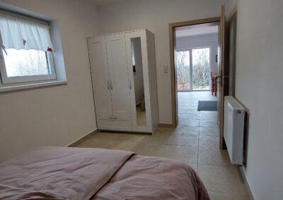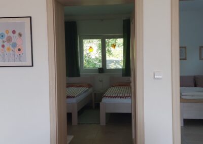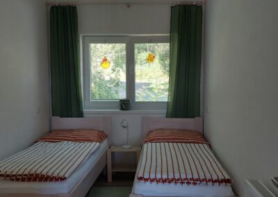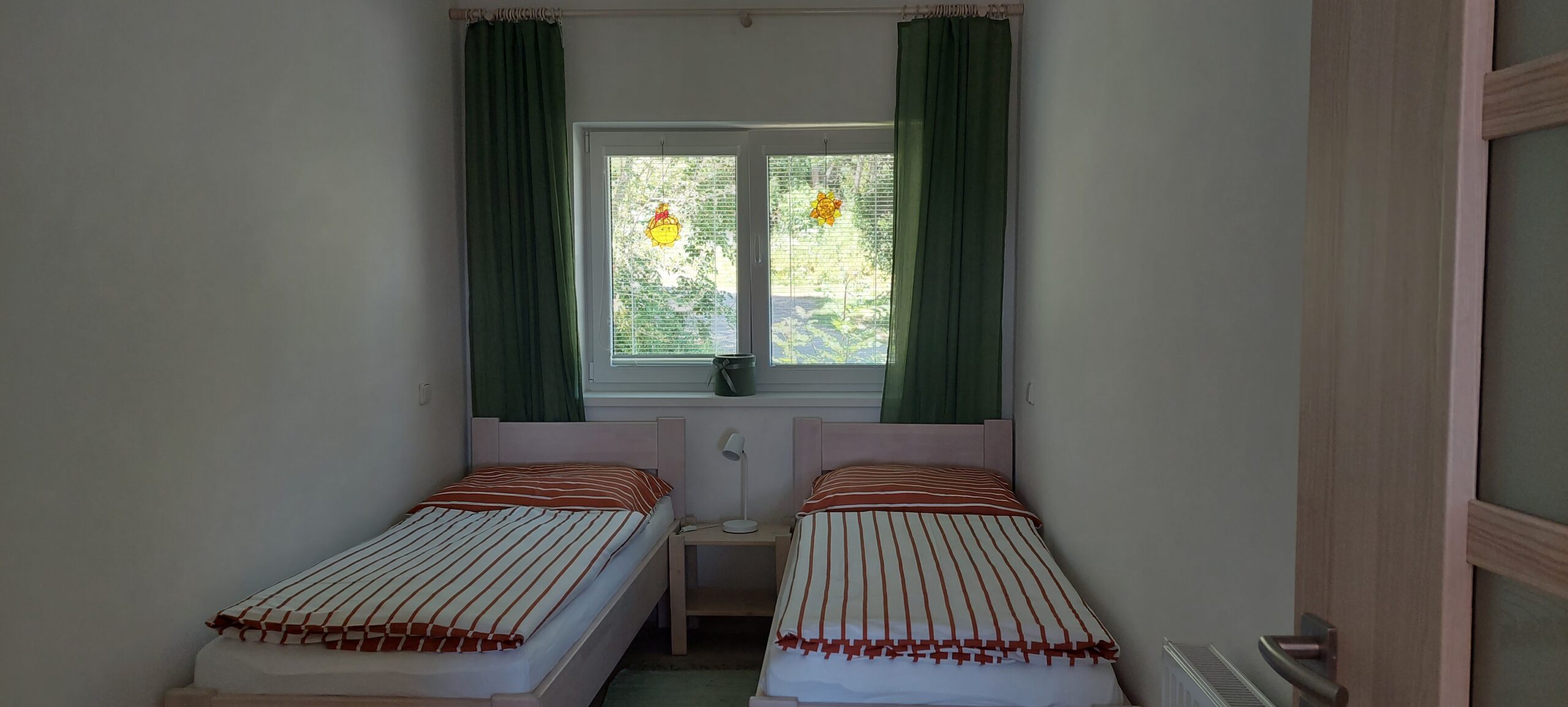 Ložnice I – 10,5 m2 – dvě samostatná lůžka (80 x 200cm), noční stolek, lampička a šatní skříň (police, tyč s ramínky).