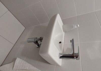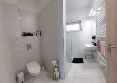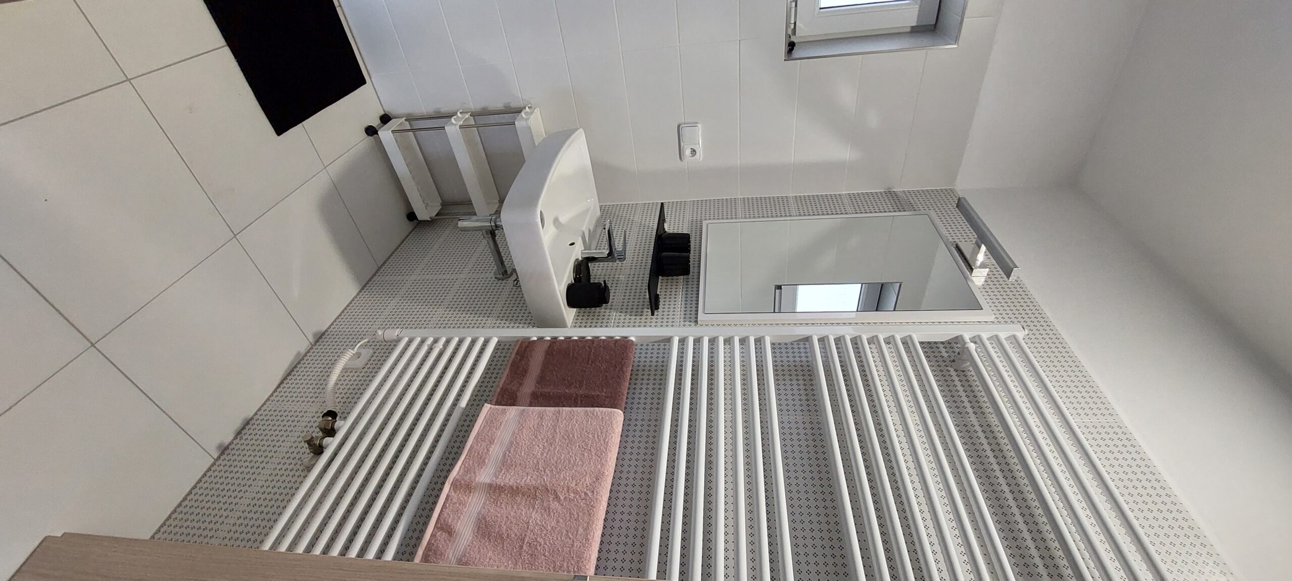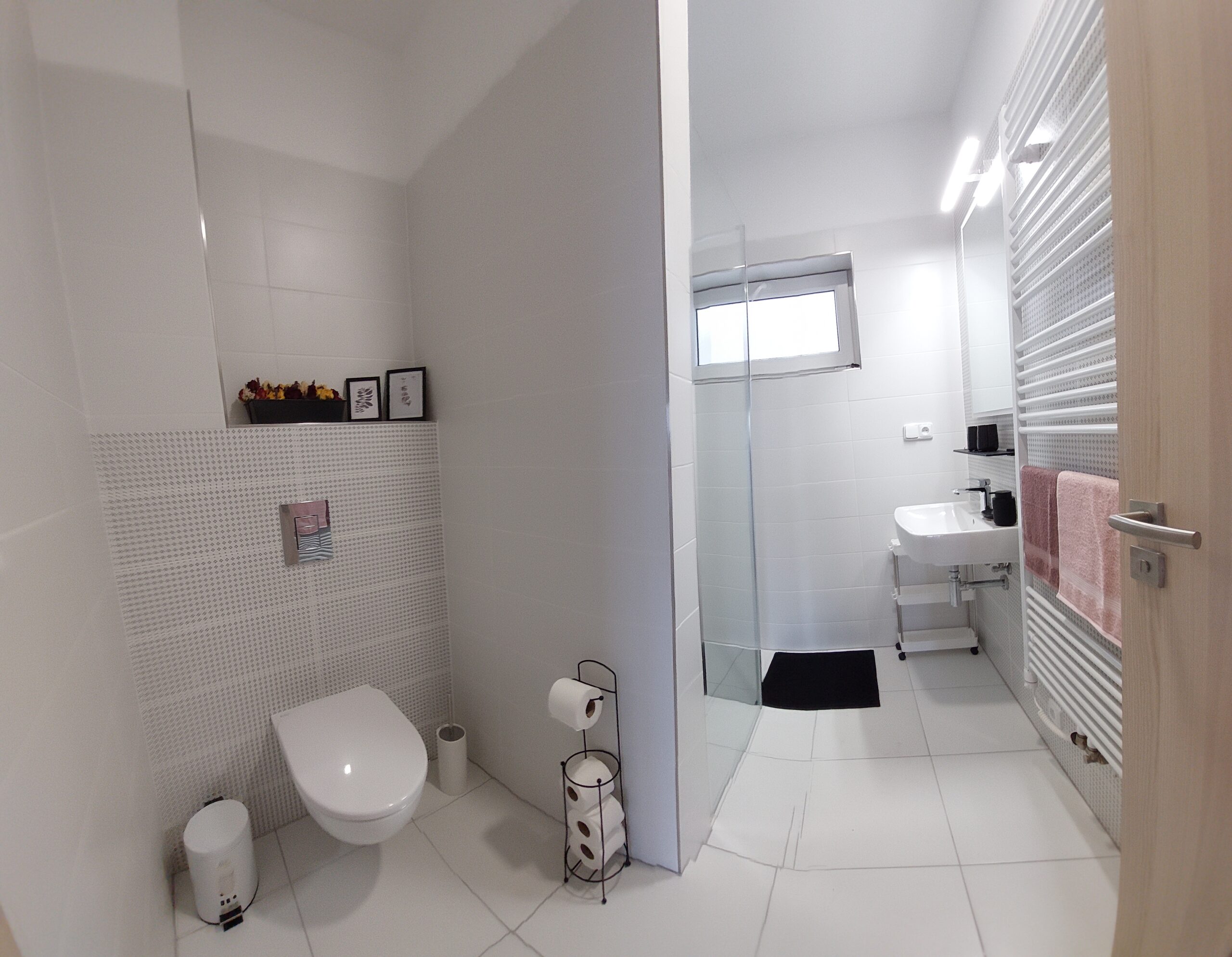 Koupelna: WC, sprchový kout, umyvadlo, elektrický žebřík. Samostatné WC s malým umyvadlem.