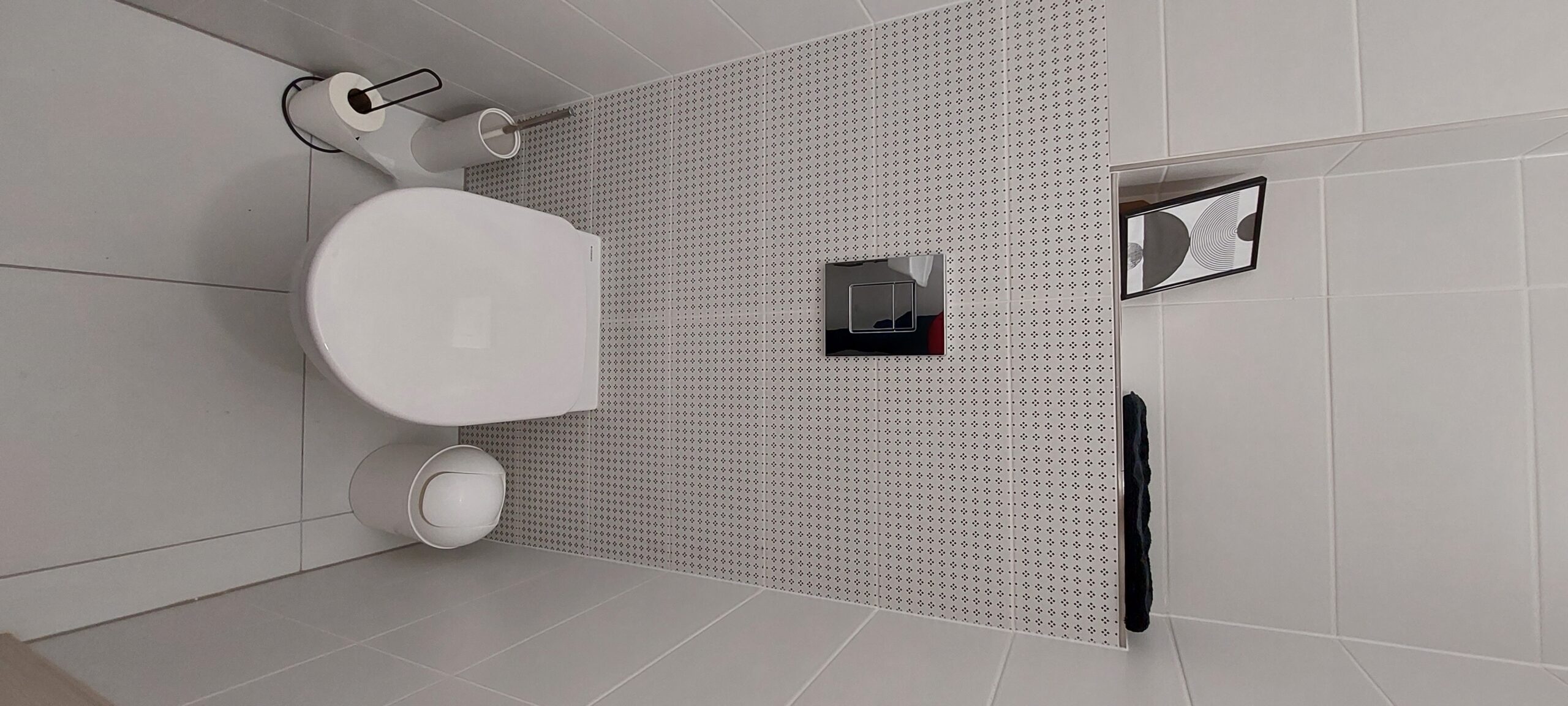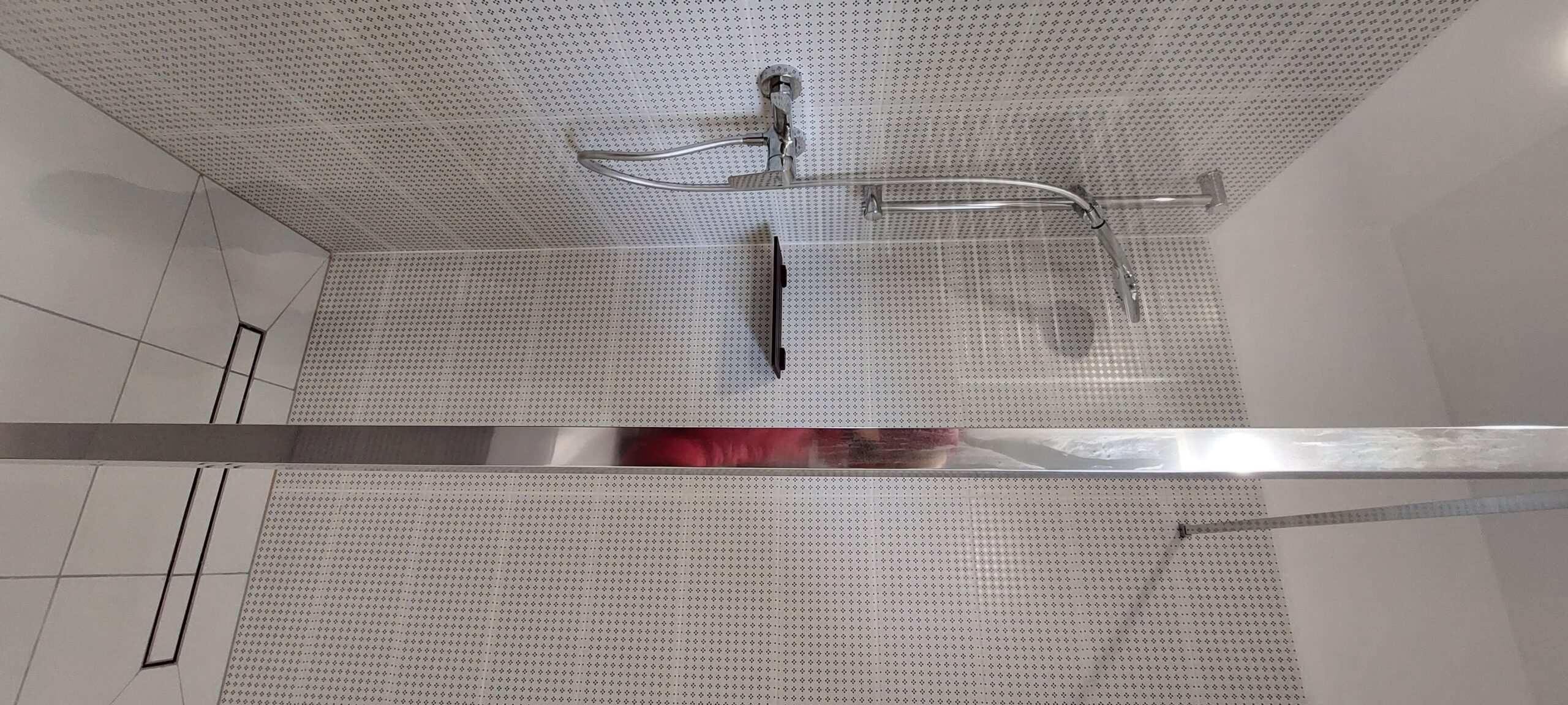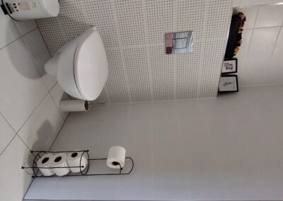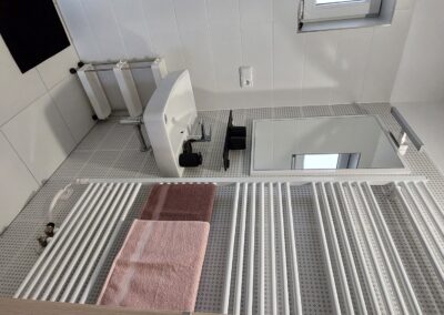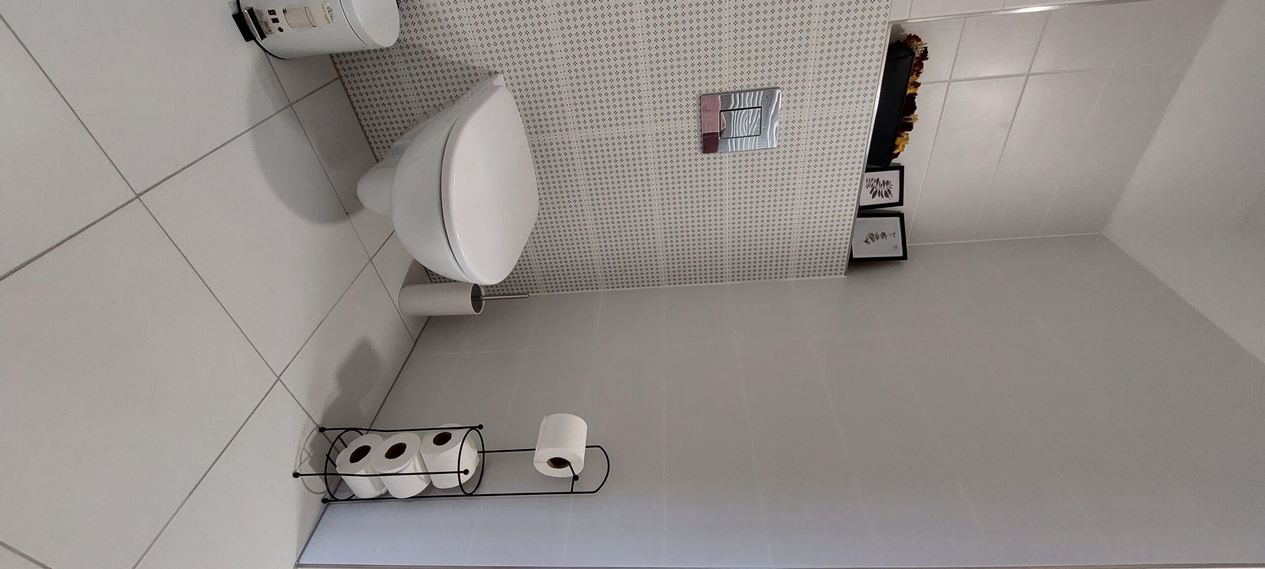 Koupelna: WC, sprchový kout, umyvadlo, elektrický žebřík. Samostatné WC s malým umyvadlem.