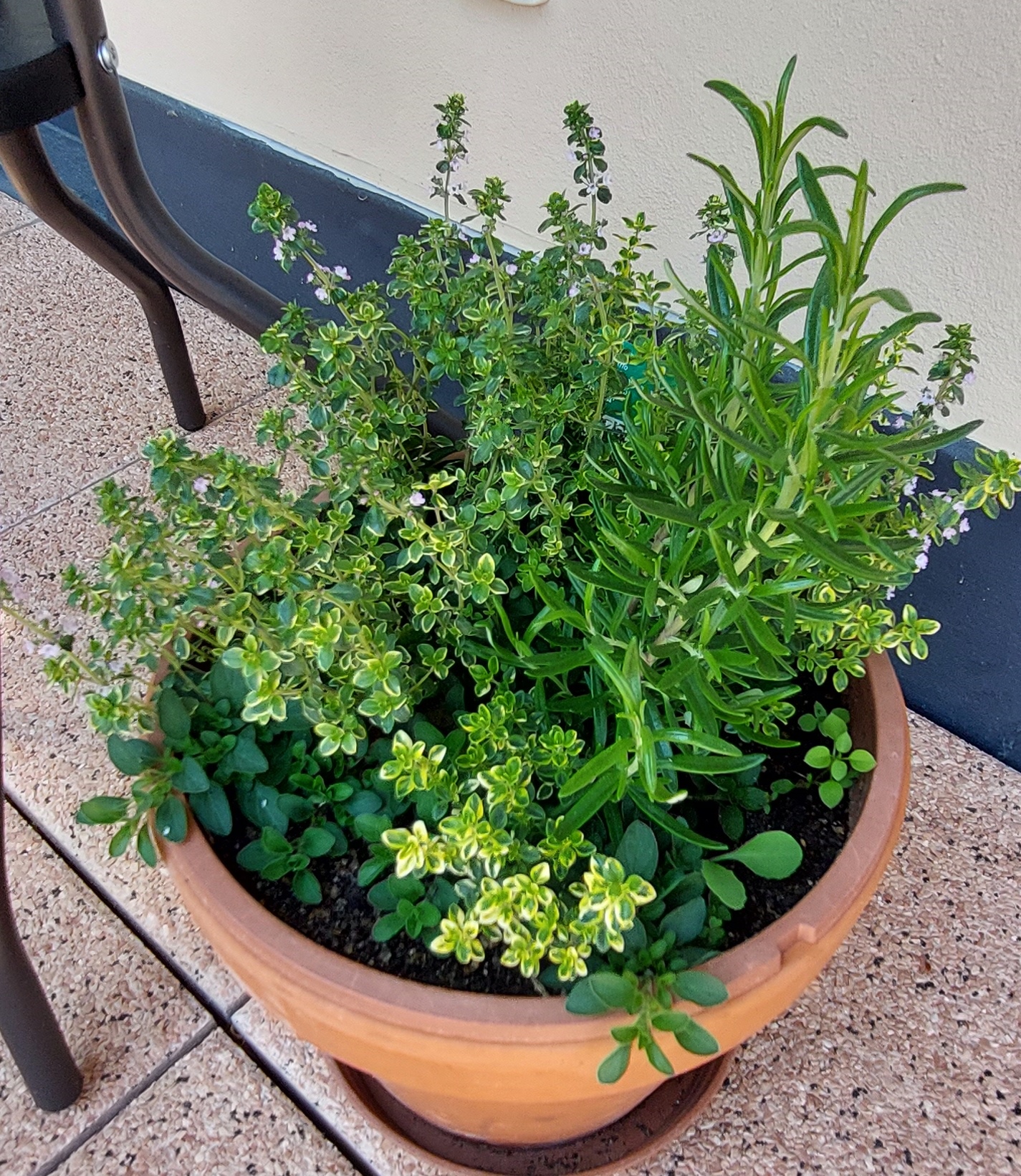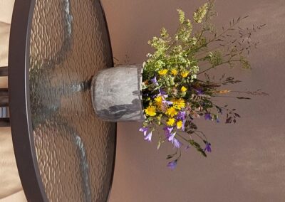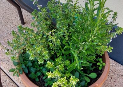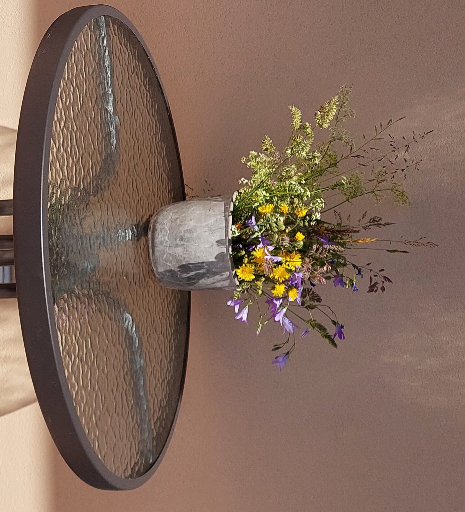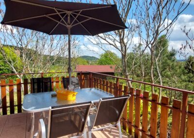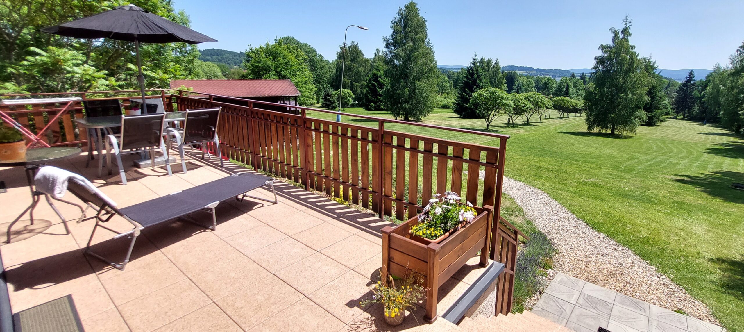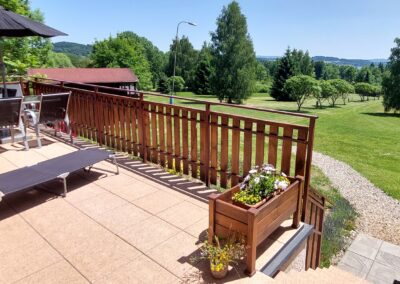 Terasa – zahradní nábytek /jídelní stůl, 4 židle, malý stolek a zahradní křesílka z obývací místnosti, 1x lehátko – nosnost max. 80 kg/.