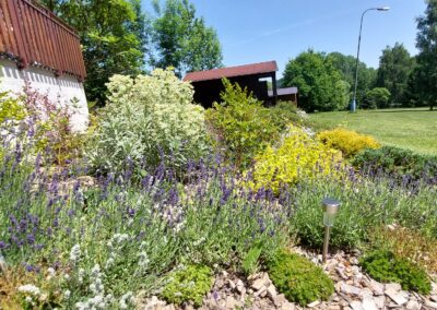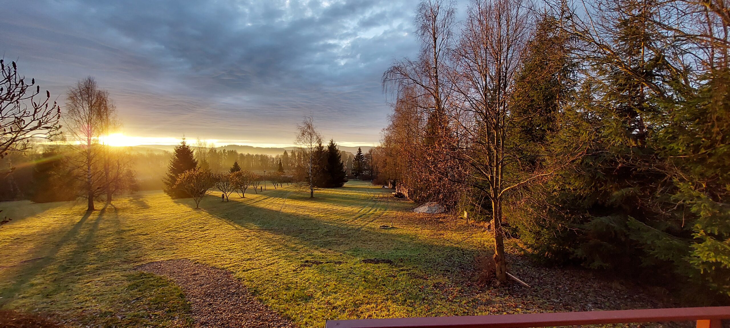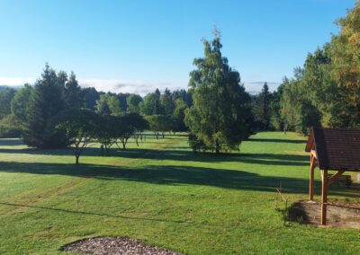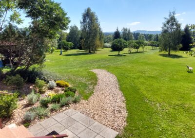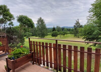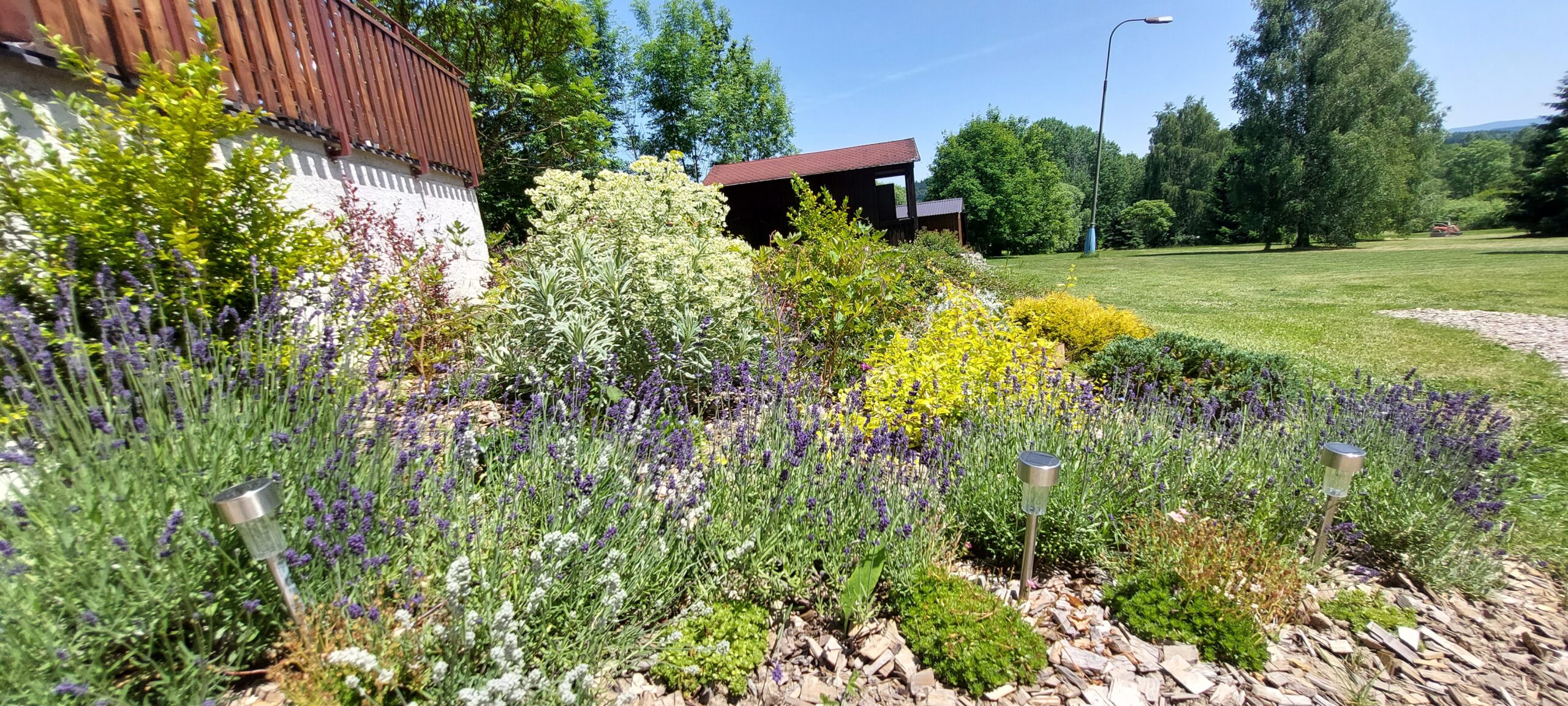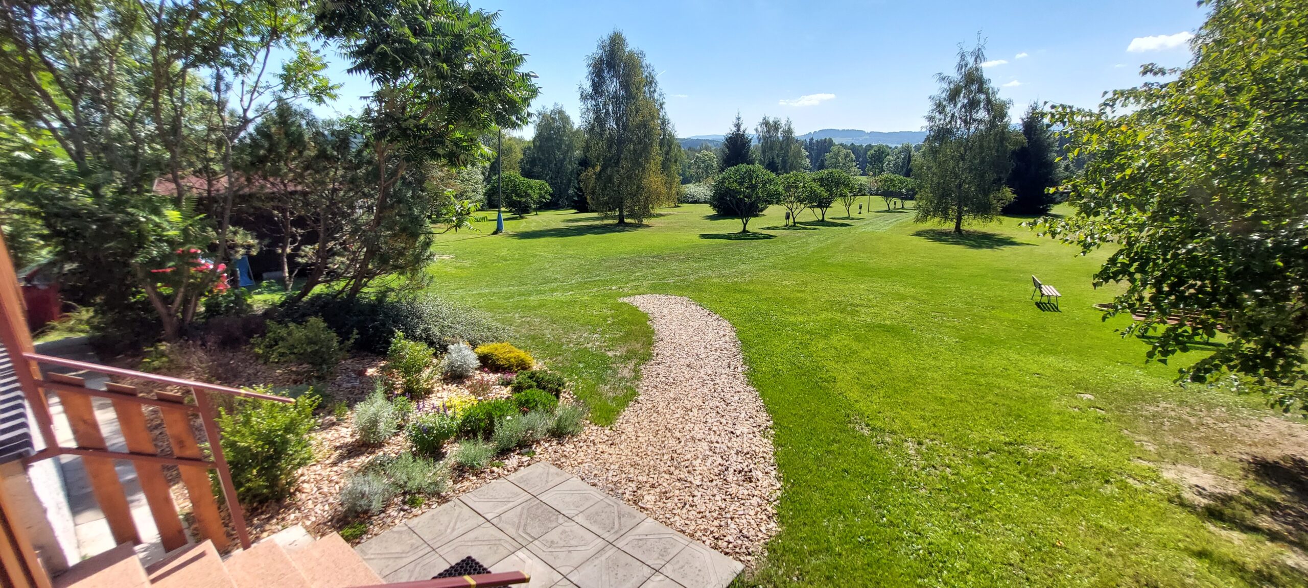U objektu na soukromém oploceném pozemku-v dolní části /u silnice/ je pozemek oplocený hustým vzrostlým živým plotem, u vjezdu na pozemek není plot, ale je zde ruční závora. Garáž na kola. Přístupová cesta je zpevněná – luční. Pozemek je louka /1,5 ha/ se vzrostlými stromy a keři s částečným výhledem na jezero.