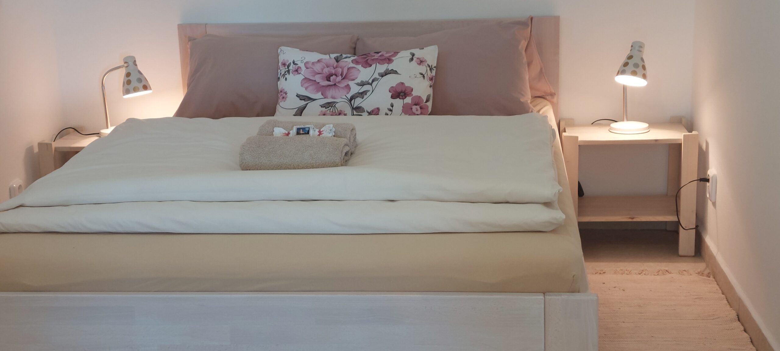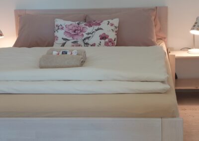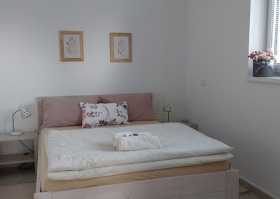 Ložnice II – 10,5 m2 – dvou – lůžko (140 x 200cm), 2x noční stolek, lampičky, šatní skříň (police, tyč s ramínky, zásuvka).