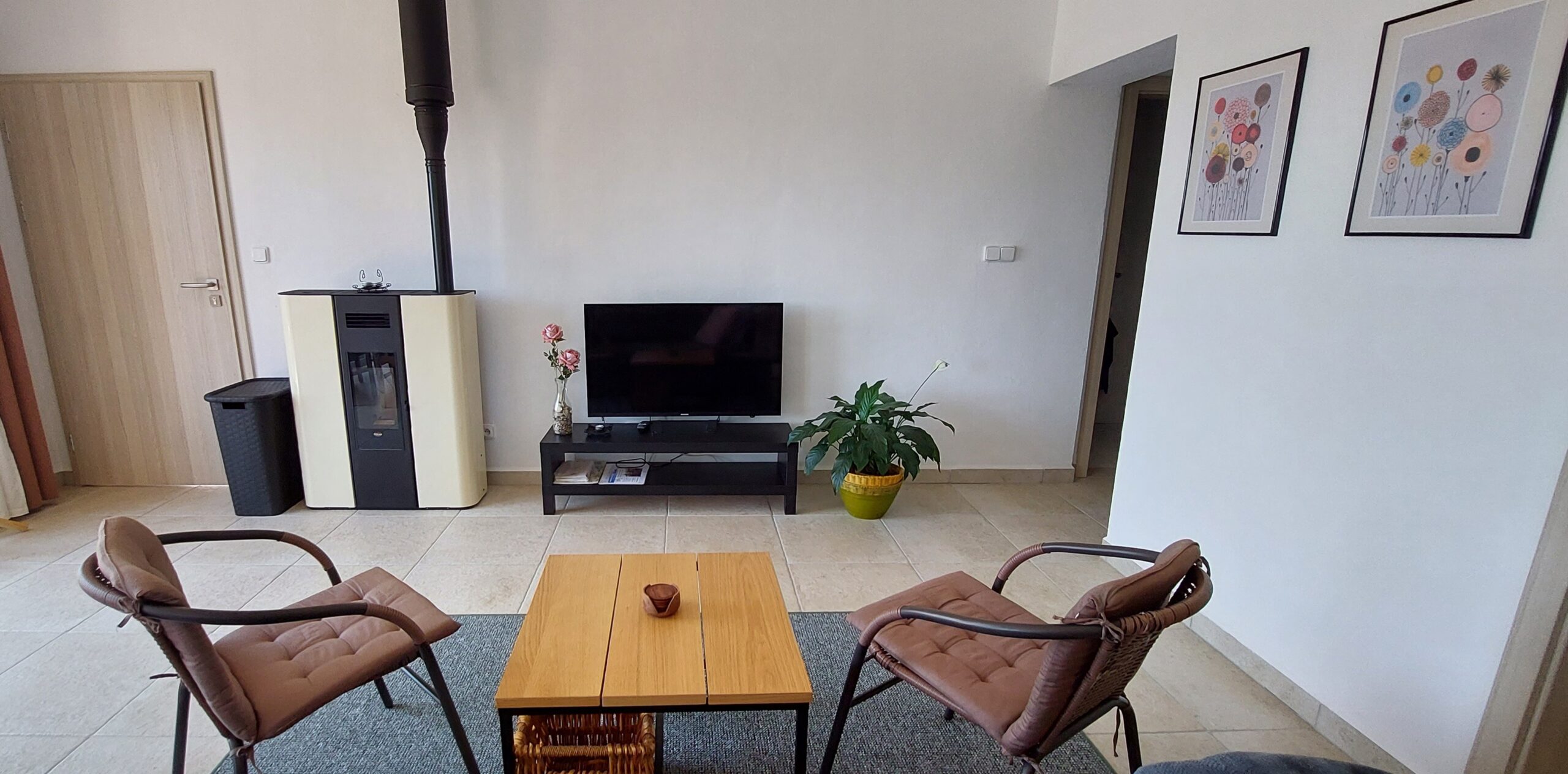 Kamna na pelety s proskleným topeništěm dodávají obytné místnosti příjemnou atmosféru. V žádných dalších místnostech není možnost topení. Ložnice se vytápí těmito kamny z obytné místnosti, které jsou kapacitně na vytápěnou plochu dostačující. Kamna se spouští automatickým ovládáním – samo – zážehem. Jde tedy o velmi komfortní způsob topení.