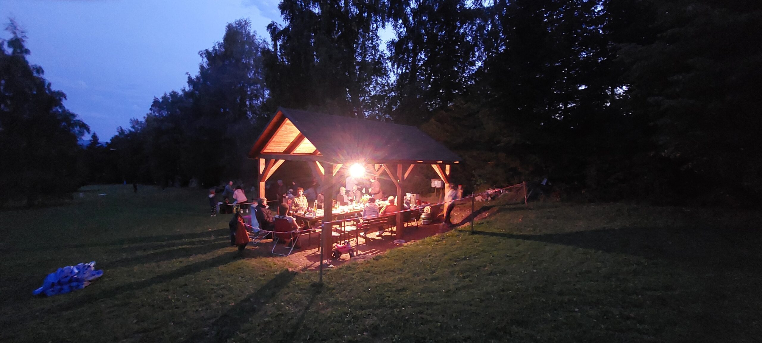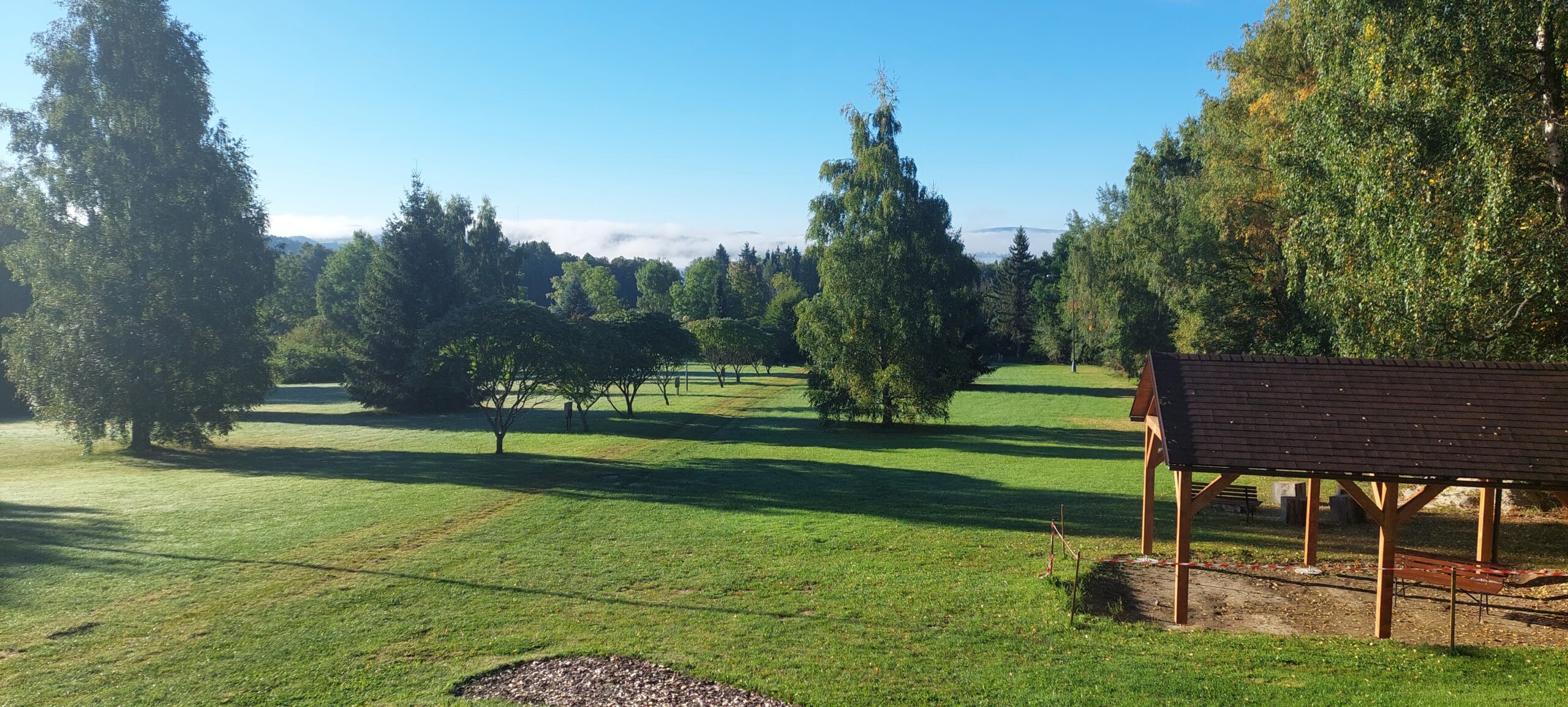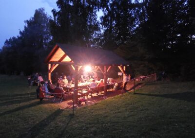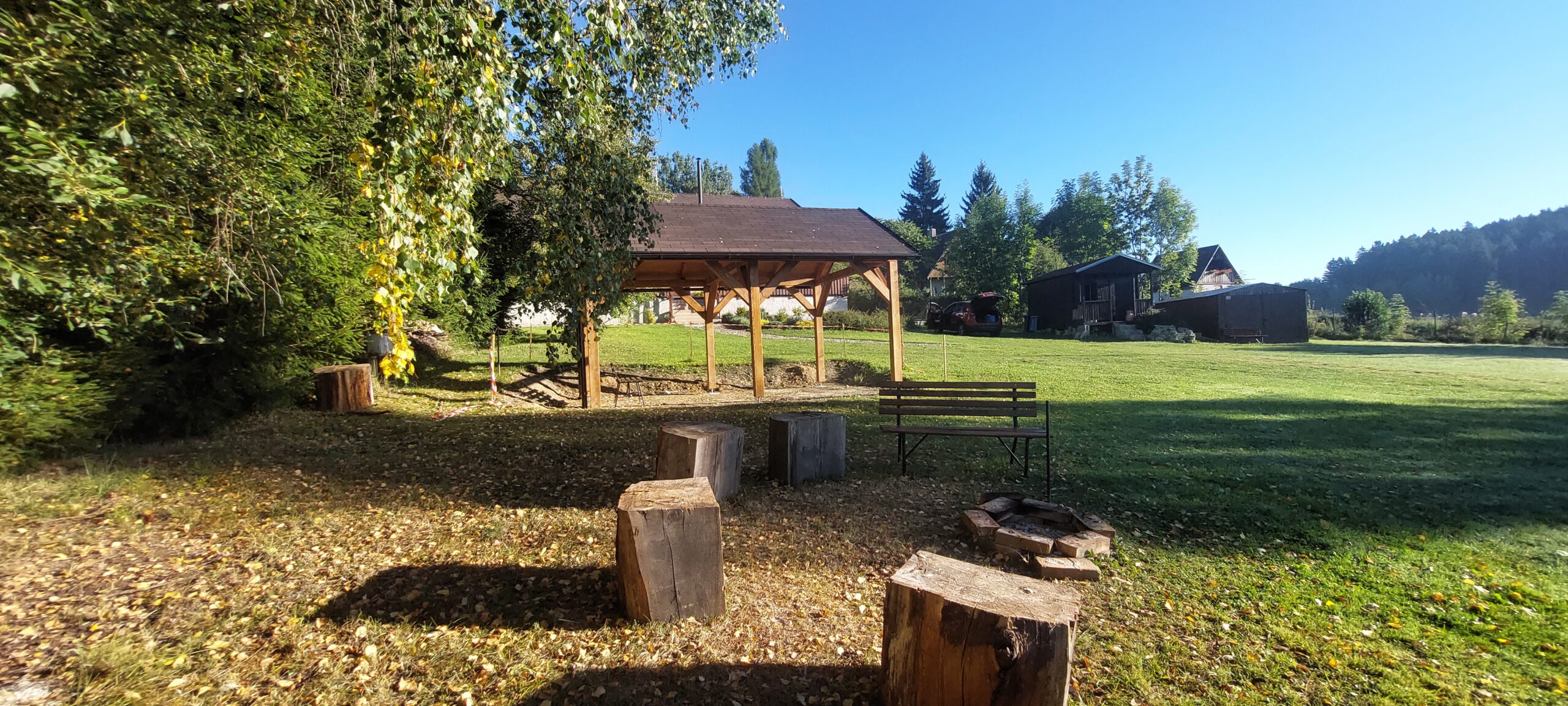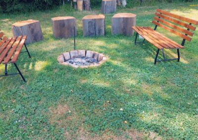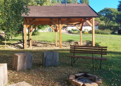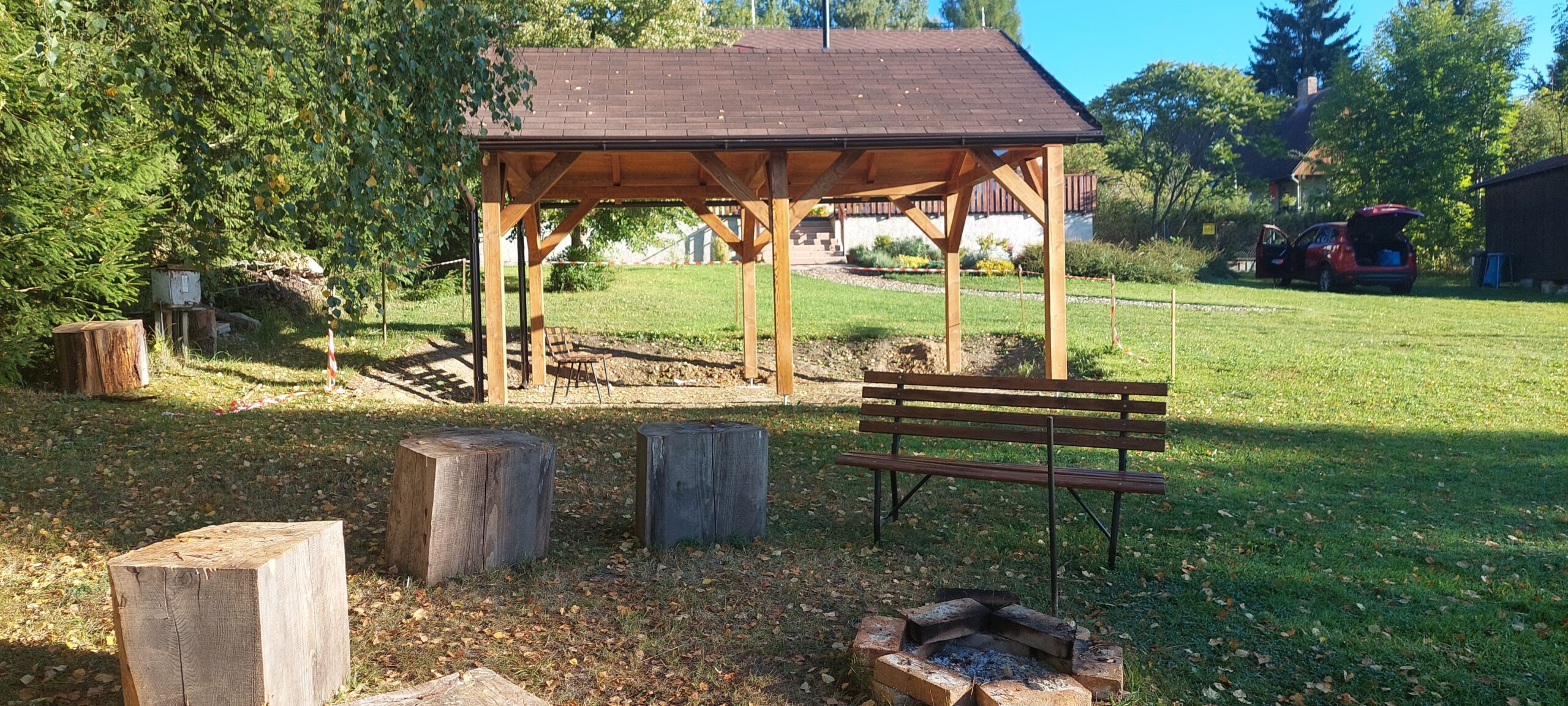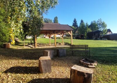 Ohniště s roštem a lavičkami. Pergola až pro 12 osob. Možnost rezervace plynového grilu, nutno předem objednat. /gril je mírně zpoplatněn/.