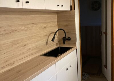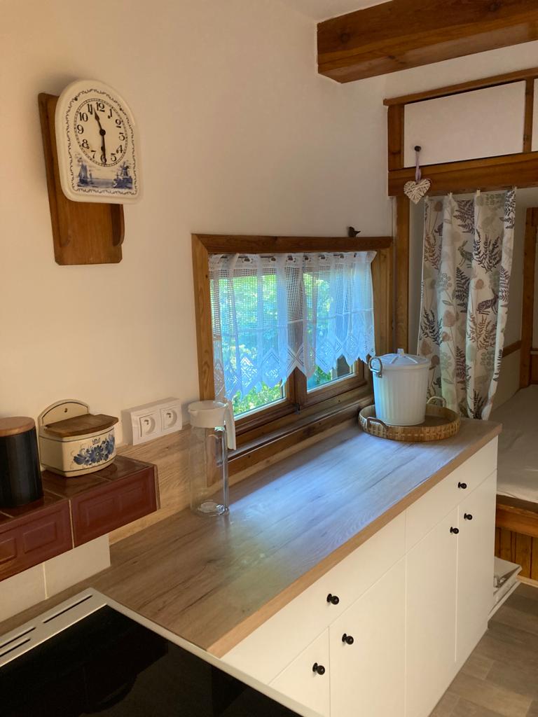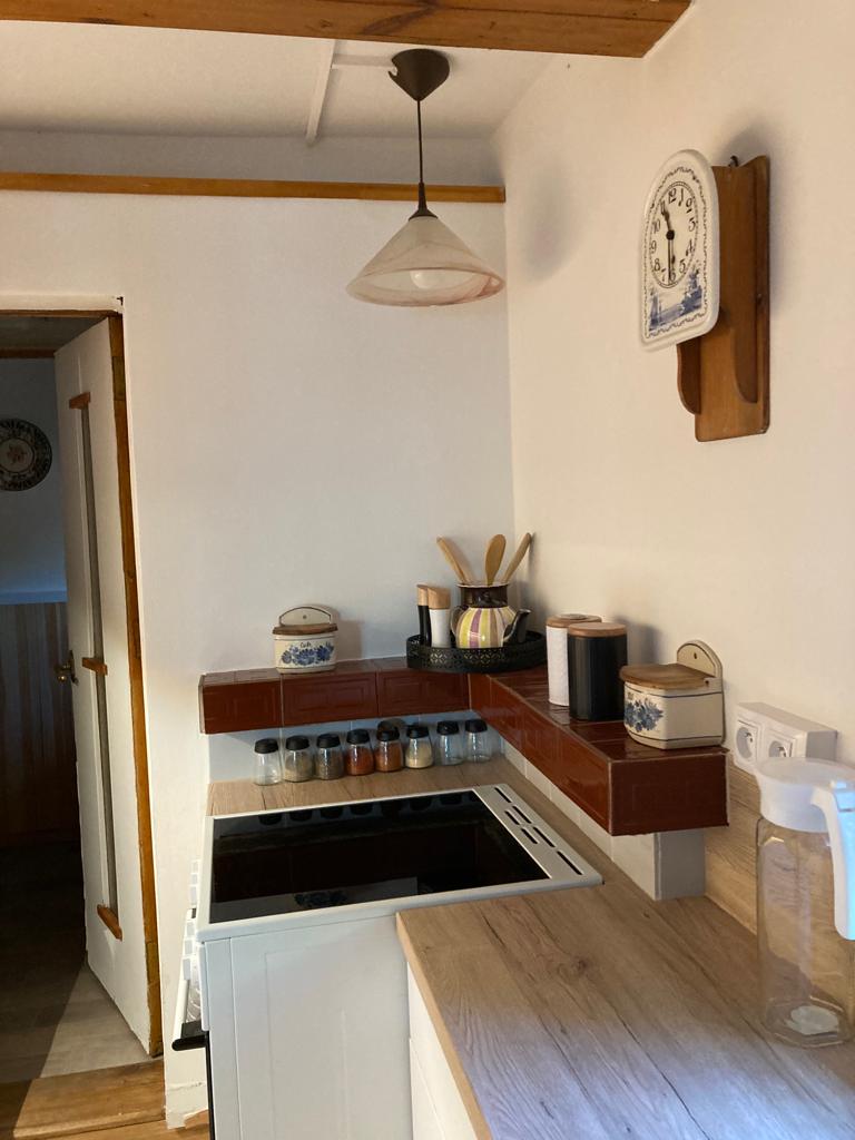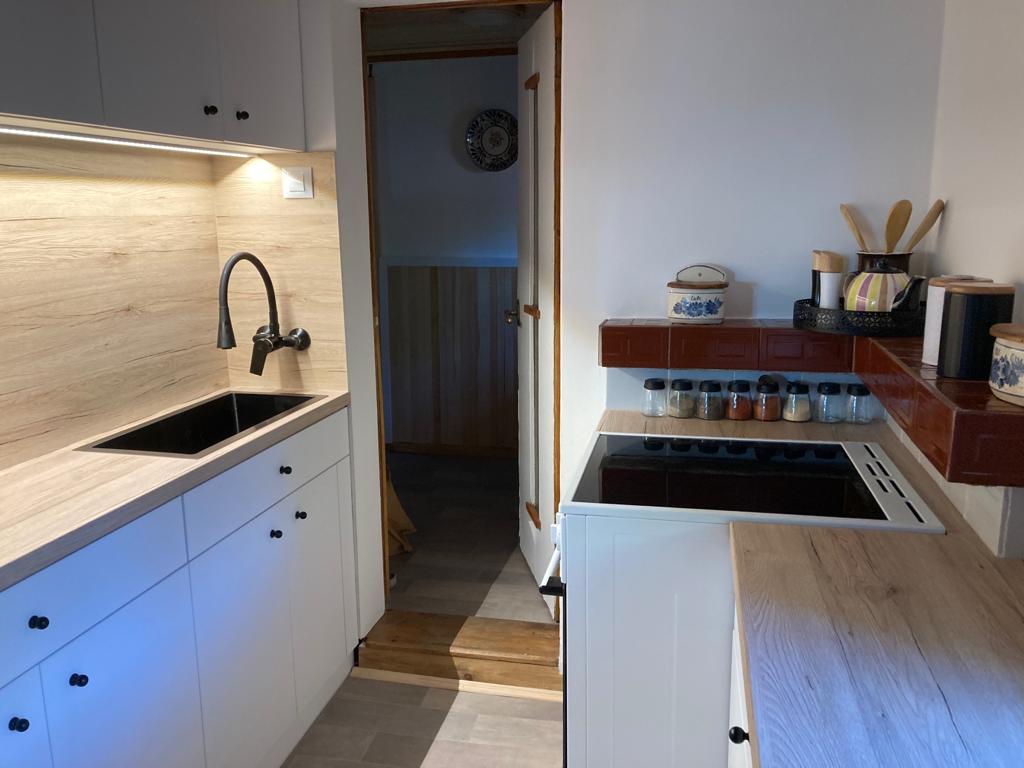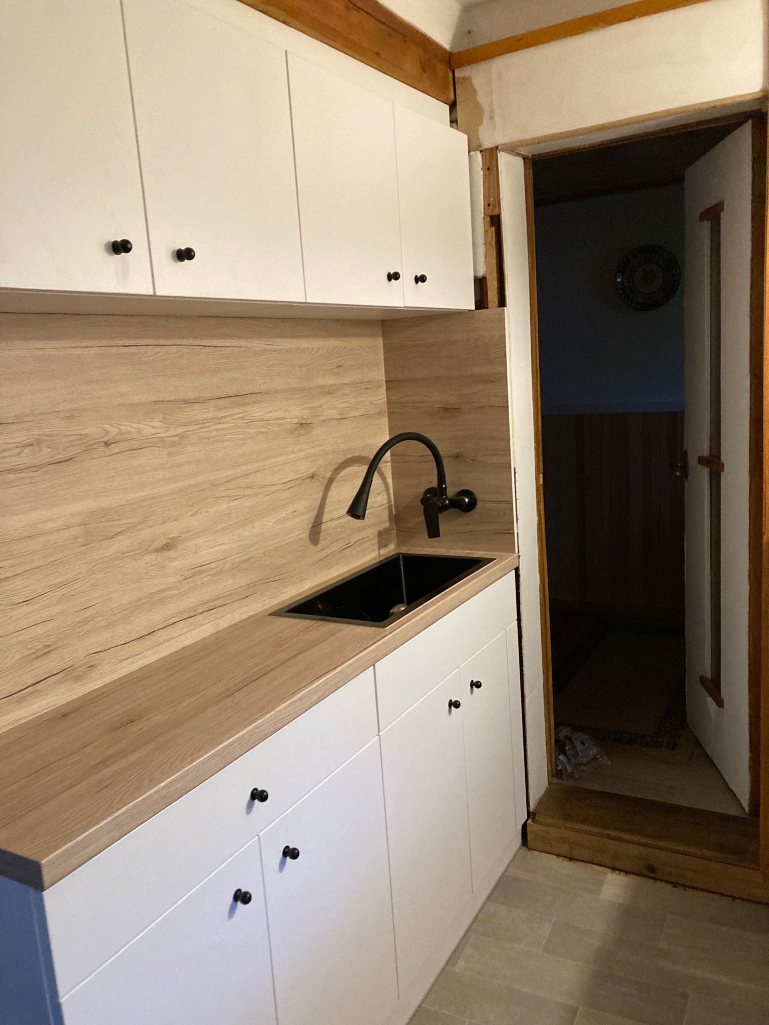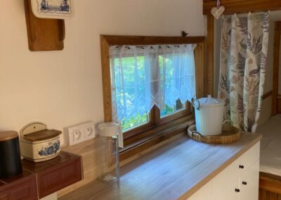 Kuchyňský kout: kuchyňská linka, 2-plotýnková varná deska, pečící trouba,, varná konvice, mikrovlnná trouba, lednička s malým mrazícím boxem, voda užitková, základní nádobí ke stolování a vaření.