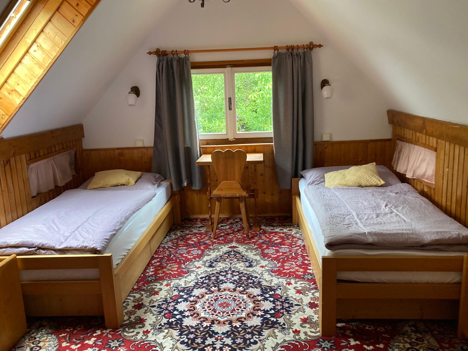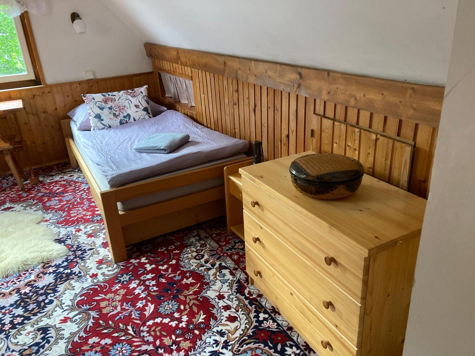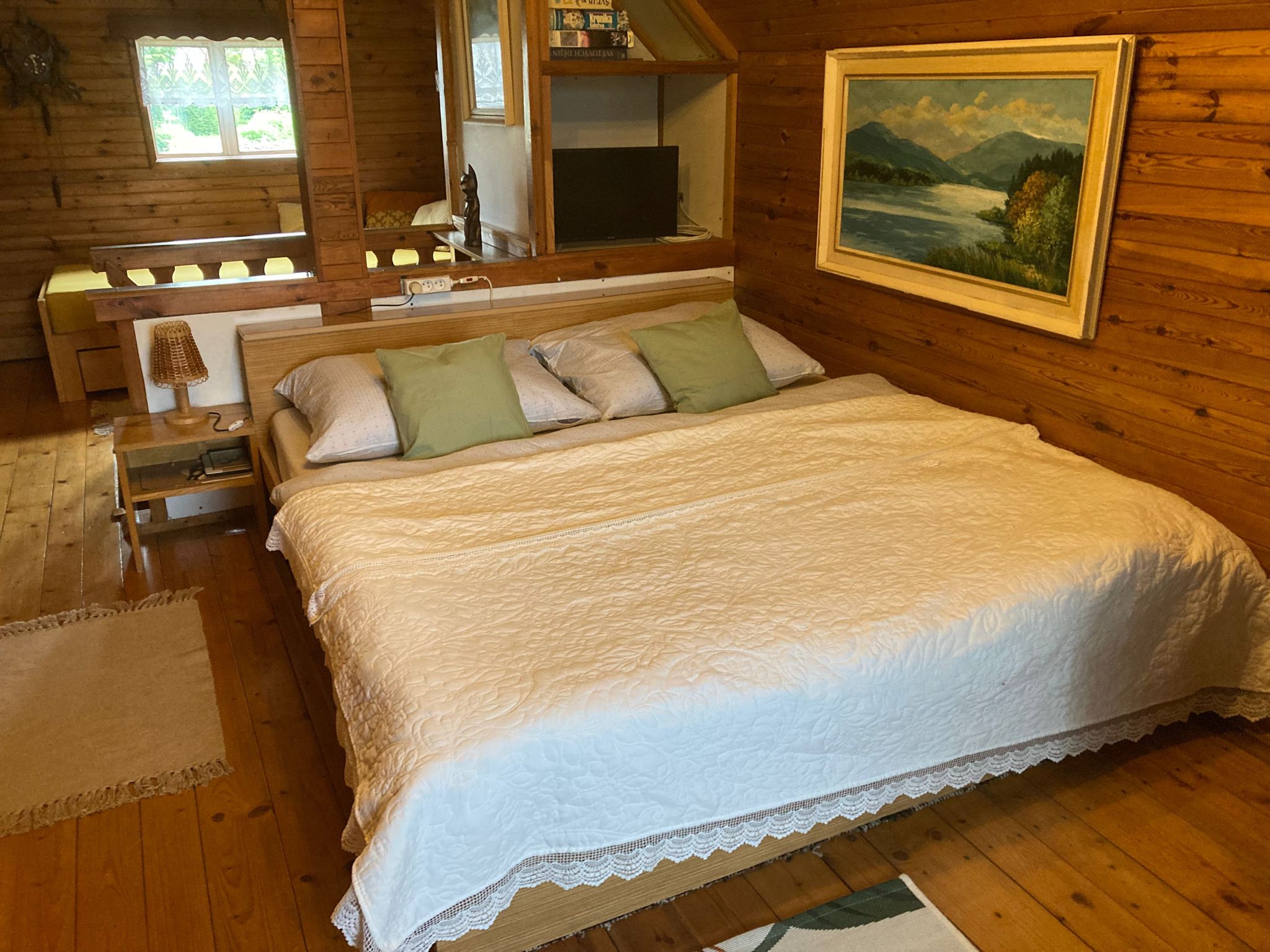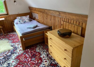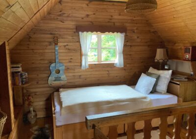 Podkroví: příkré schody s velmi úzkými nášlapy. Ložnice I, spaní na galerii –1x samostatné lůžko, 1x 2-lůžko, křesílka, poličky na ošacení, komoda, úzká lodžie se zahradním nábytkem a výhledem na jezero. Z této místnosti se prochází do