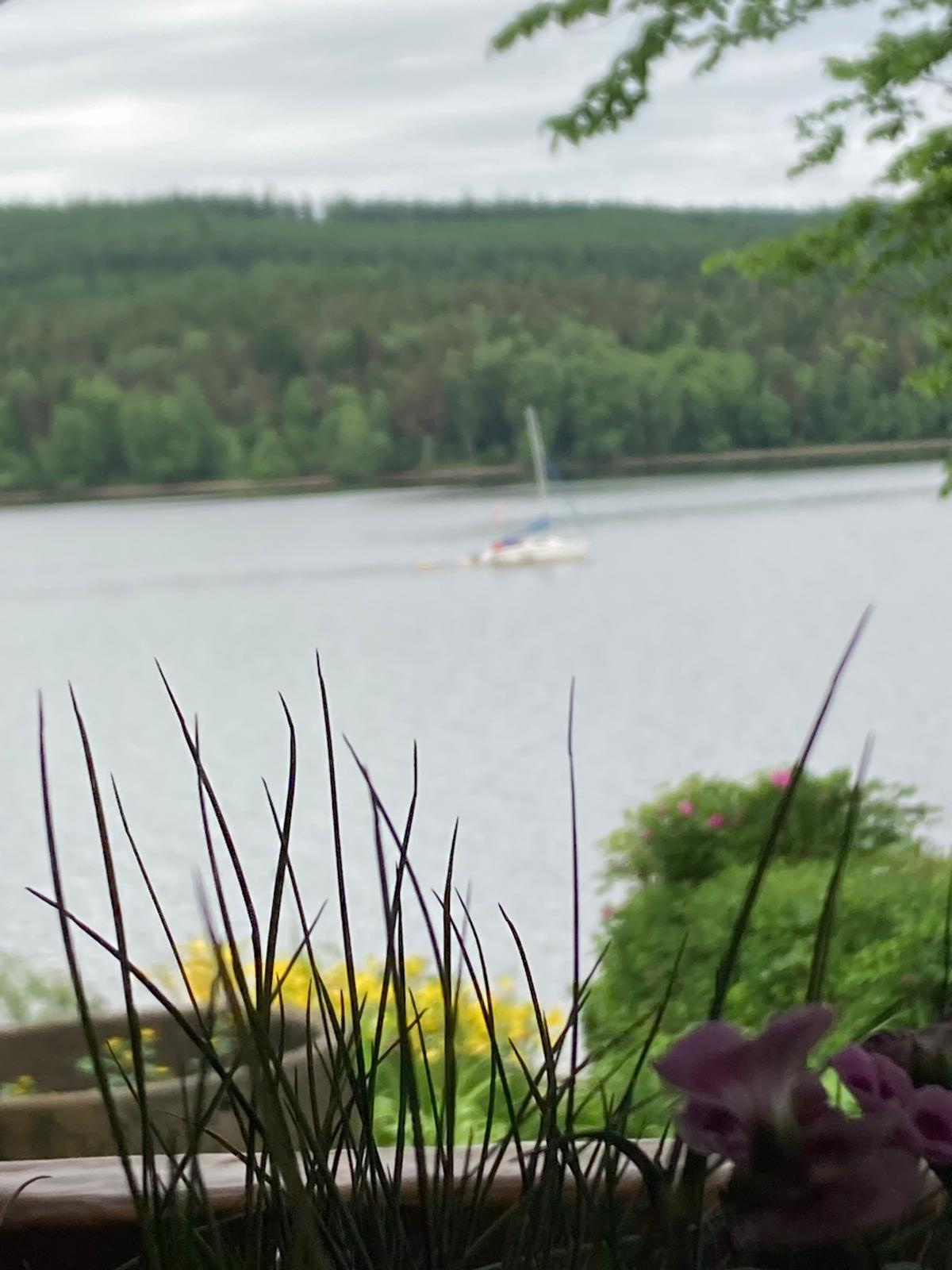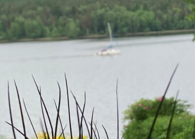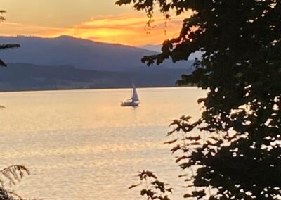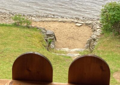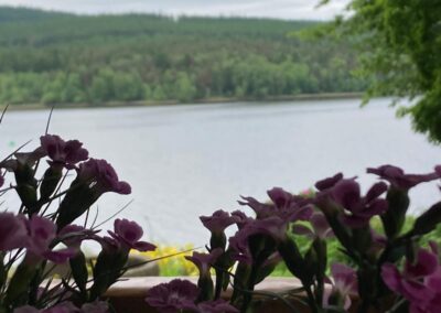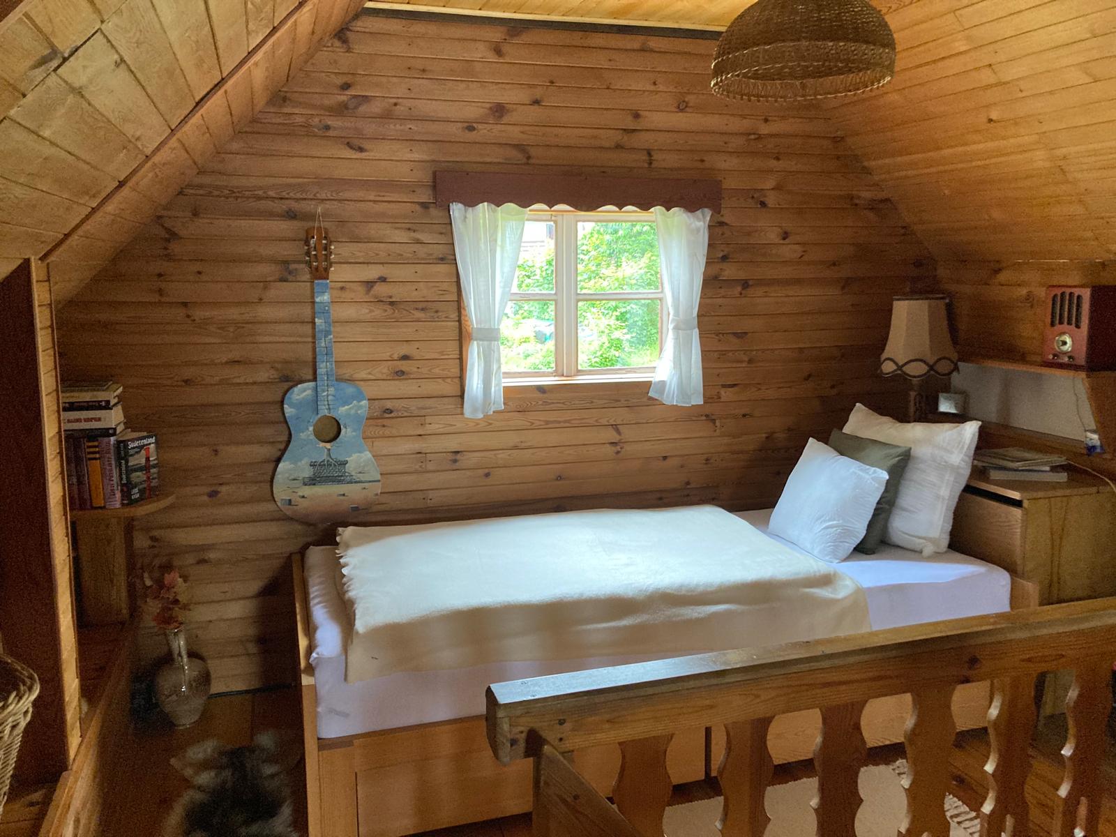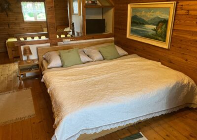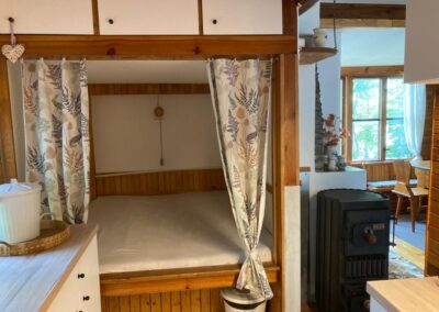 Podkroví: příkré schody s velmi úzkými nášlapy. Ložnice I, spaní na galerii –1x samostatné lůžko, 1x 2-lůžko, křesílka, poličky na ošacení, komoda, úzká lodžie se zahradním nábytkem a výhledem na jezero. Z této místnosti se prochází do