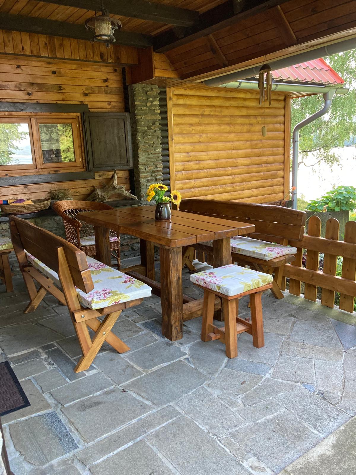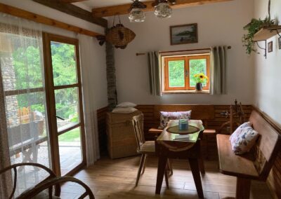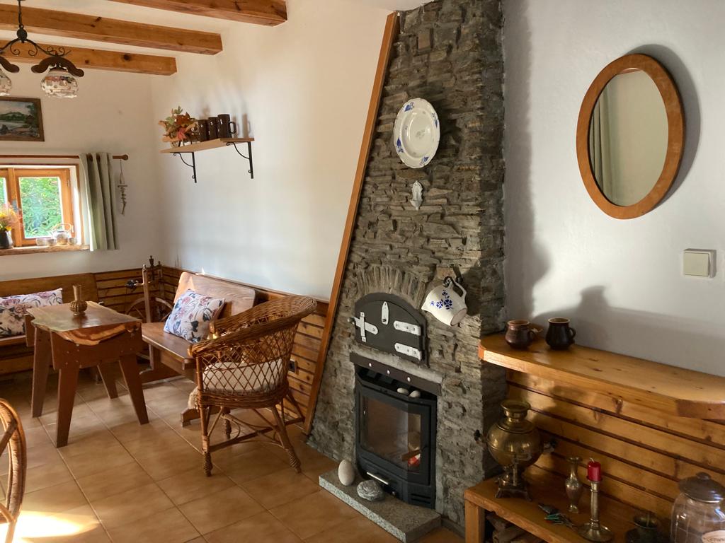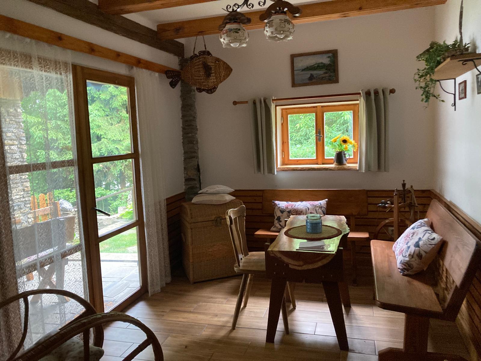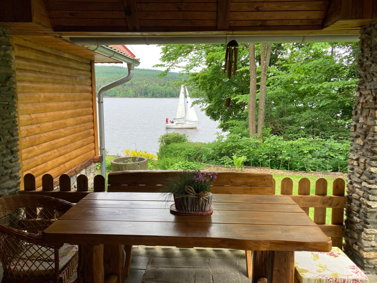 Obytná místnost: překrásný výhled na jezero, pohovka, stůl s lavicí a židlemi, TV, kamna na tuhá paliva /v místnosti je krb, ale pouze jako dekorativní prvek, topení v něm není povoleno/.
