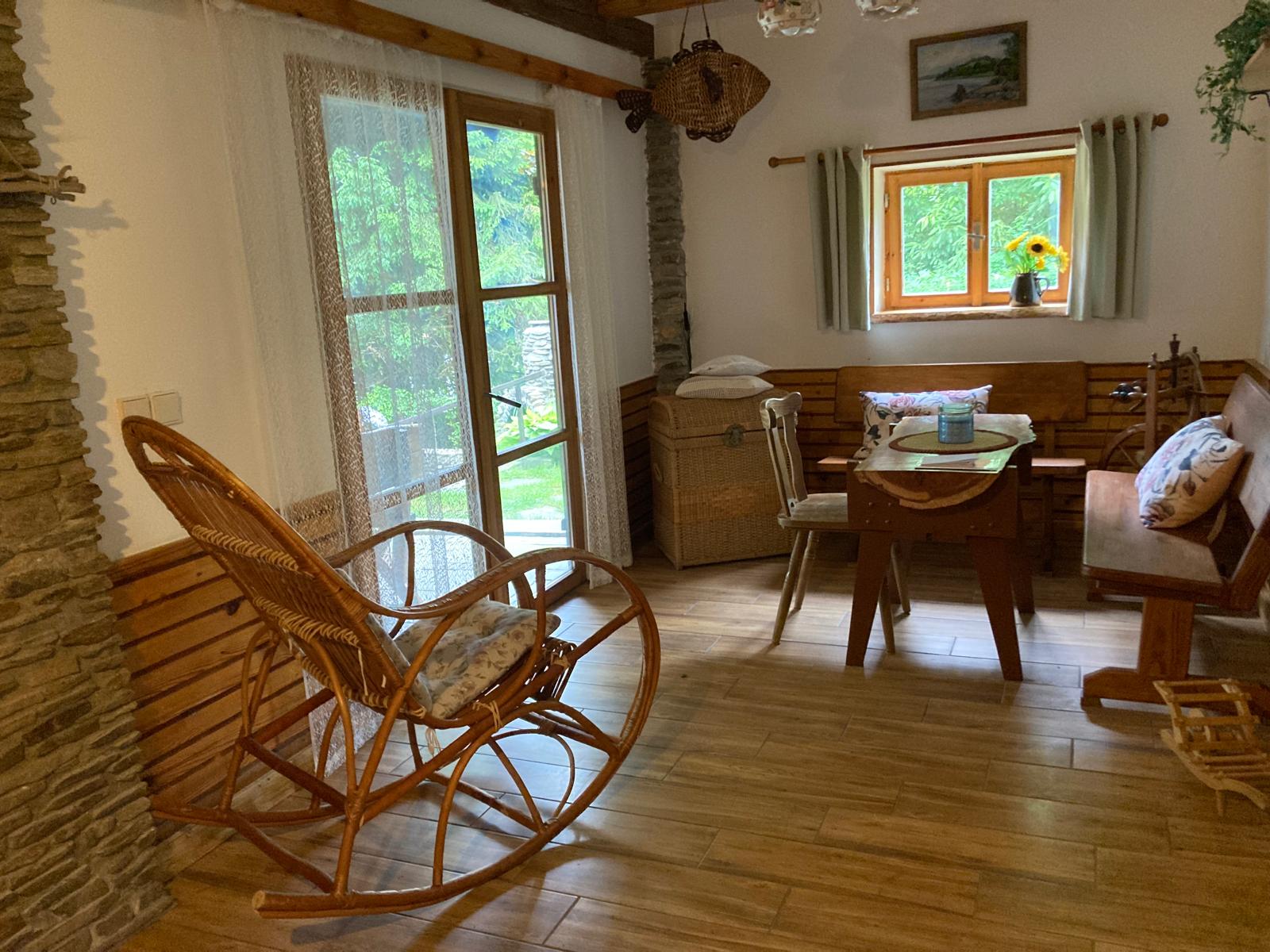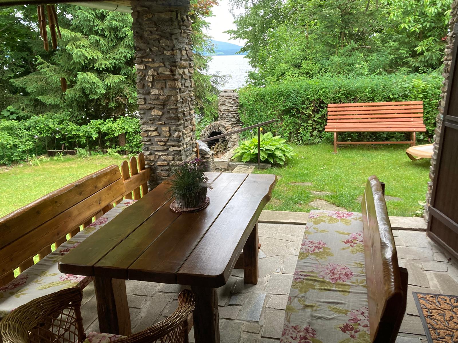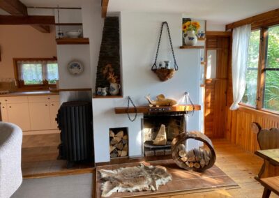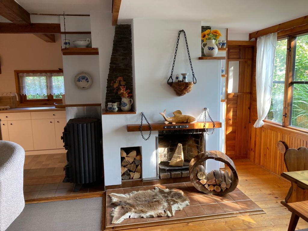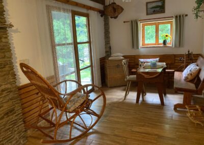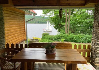 Obytná místnost: překrásný výhled na jezero, pohovka, stůl s lavicí a židlemi, TV, kamna na tuhá paliva /v místnosti je krb, ale pouze jako dekorativní prvek, topení v něm není povoleno/.