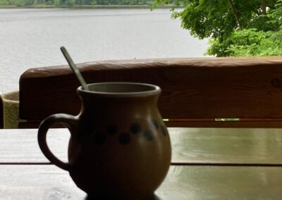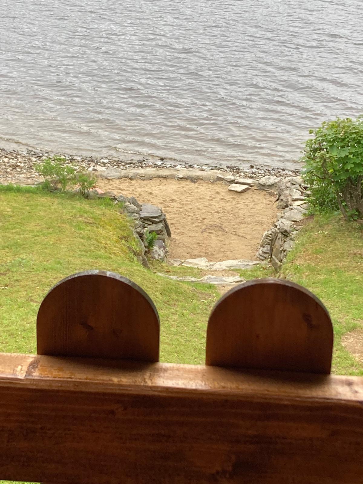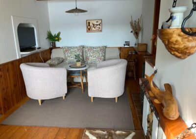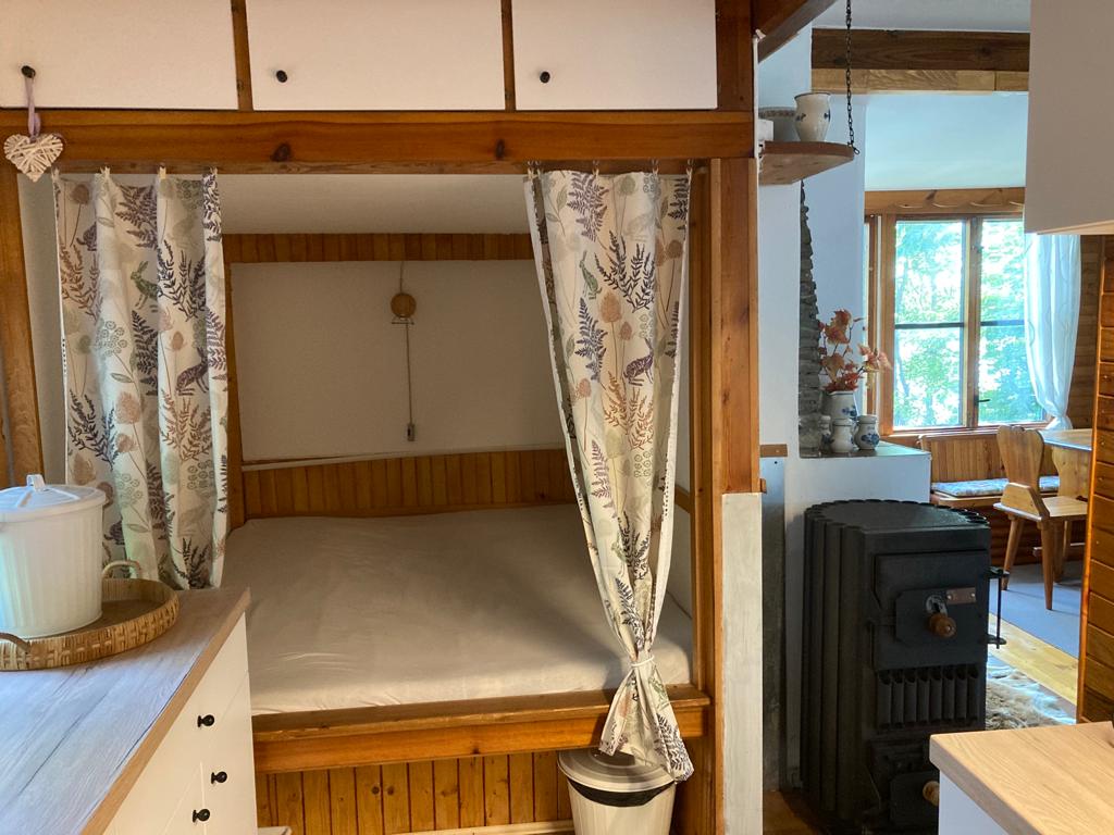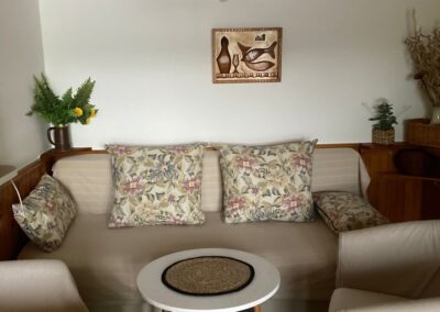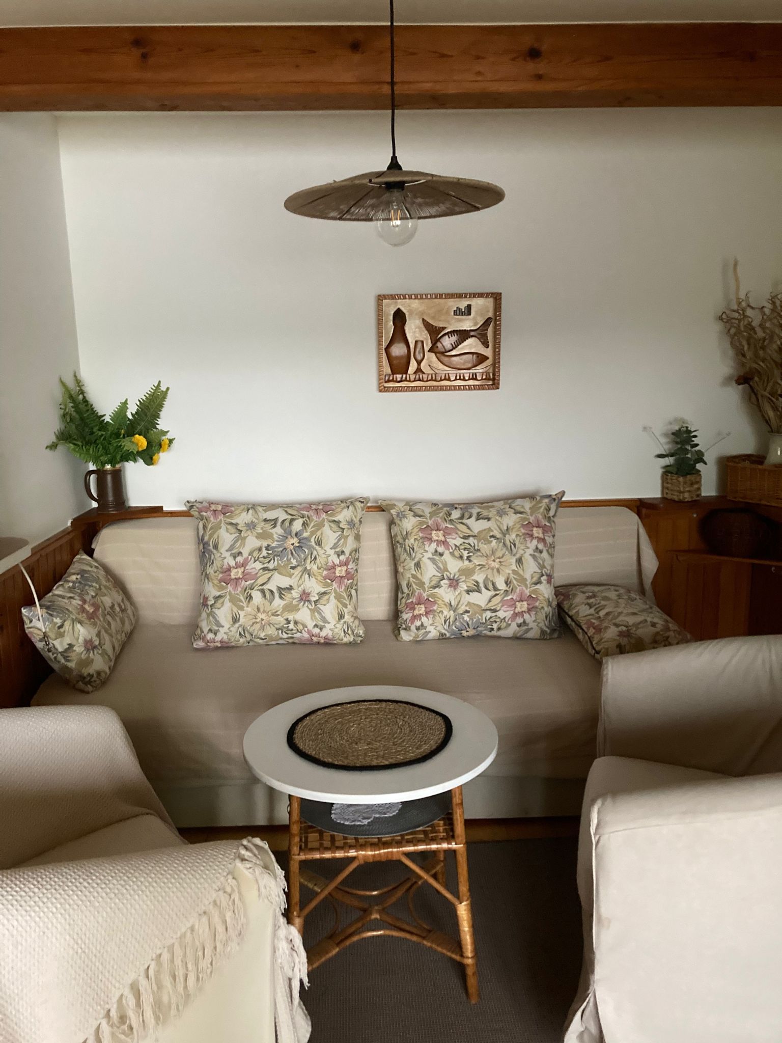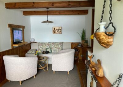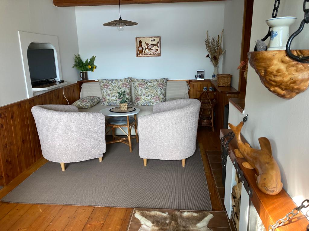 Obytná místnost: překrásný výhled na jezero, pohovka, stůl s lavicí a židlemi, TV, kamna na tuhá paliva /v místnosti je krb, ale pouze jako dekorativní prvek, topení v něm není povoleno/.