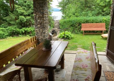 Přízemí: obytná veranda s krbovými kamny , posezením a východem na zastřešenou terasu a zahradním nábytkem a pozemek se zahradním krbem.